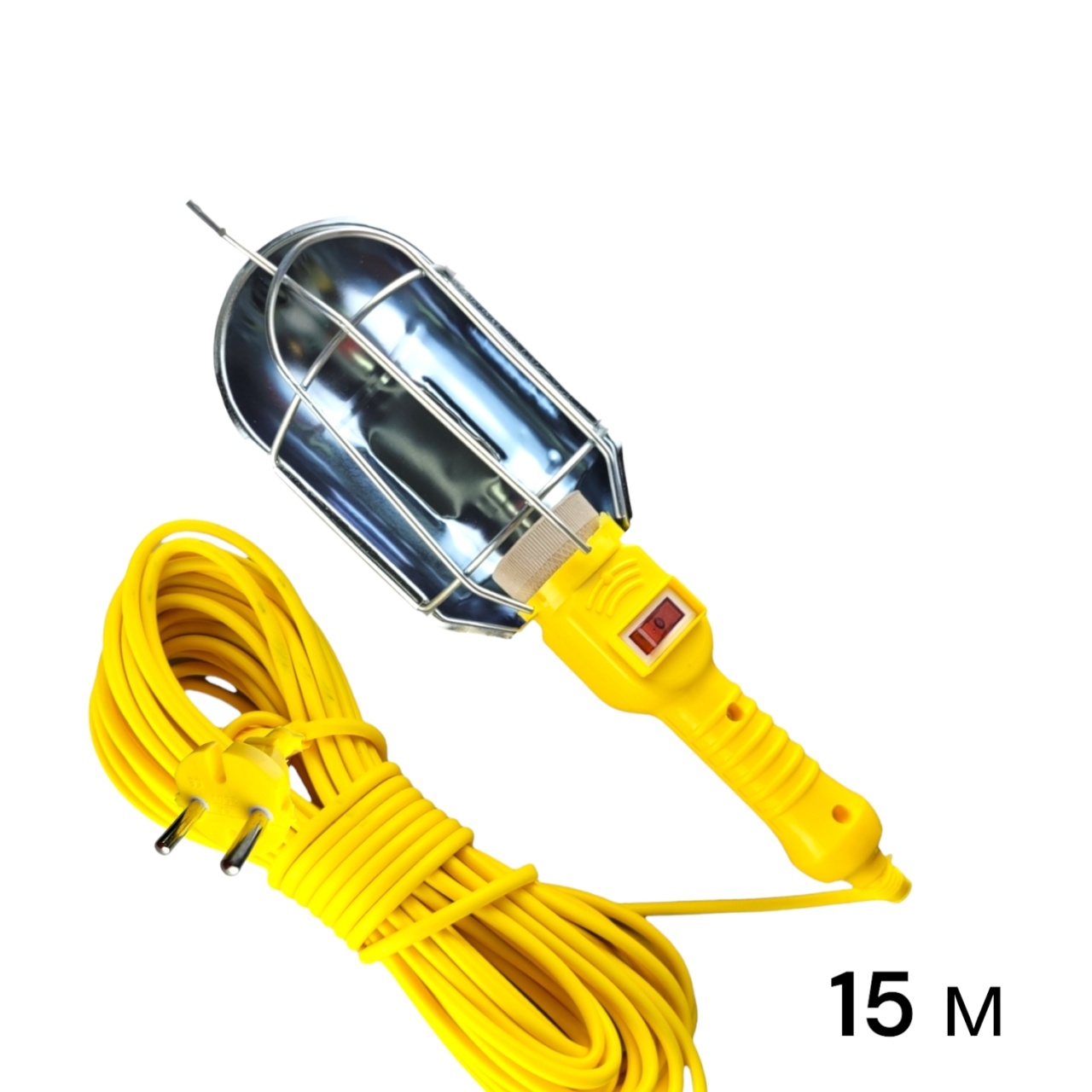 Переносной подвесной светильник 15 м имеет стандартный цоколь Е27 для ламп накаливания. Рассчитан на работу от сети переменного тока с напряжением до 220 В. Переносная лампа для гаража выполнена из жаропрочного и антикоррозийного купола и удобной ручки из ABS-пластика, на которой расположен клавишный выключатель. Для защиты лампа создана защитная стальная решетка.