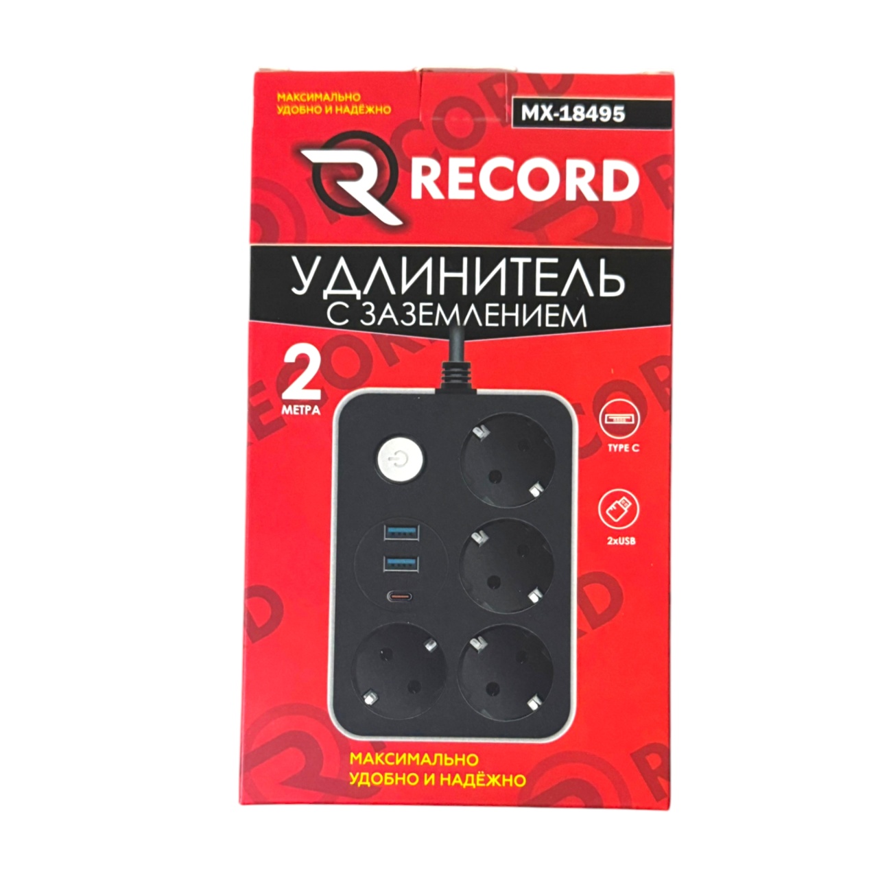 Удлинитель с заземлением 2 м, 3 Евро розетки, 2 USB порта, Type C, "RECORD" MX 18495