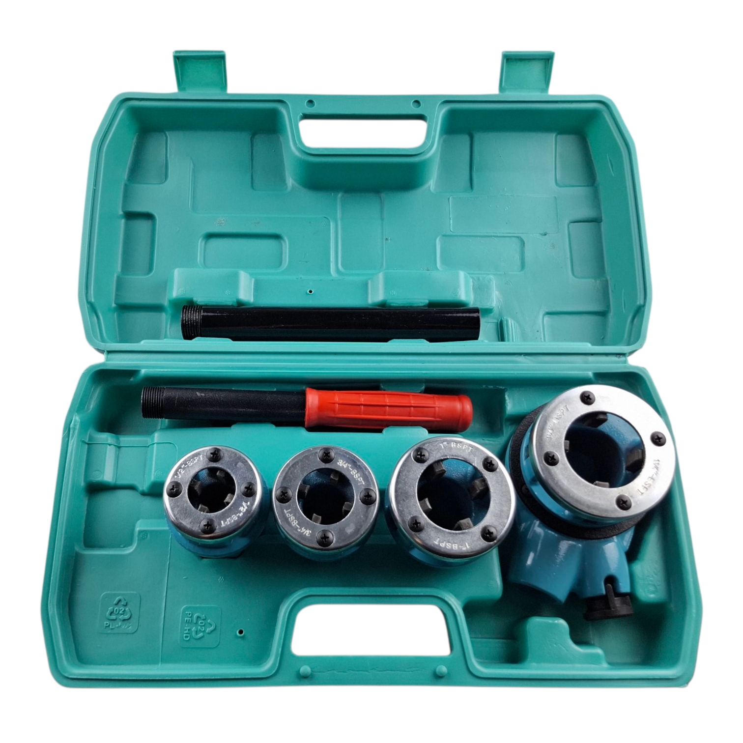 Каждая резьбонарезная головка имеет четыре отверстия для удаления стружки. Длинная ручка обеспечивает максимальное кручение при нарезании резьбы. Набор поставляется с пластиковой коробкой, что позволяет удобно транспортировать и хранить инструменты. Головки для нарезания резьбы изготовлены из чугуна, прочного и износостойкого. Резьбовая плашка: 1/2", 3/4", 1", 1-1/4" Тип резьбы: цилиндрическая трубная резьба 55 °.